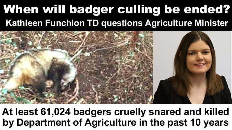 When will BADGER CULLING be ended in Ireland? Sinn Fein TD Kathleen Funchion (Carlow Kilkenny) has questioned the Minister for Agriculture about his Department’s cruel cull which has caused the deaths of at least 61,024 badgers in the past 10 years alone