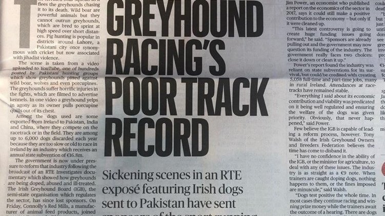 Among the dogs used are some exported from Ireland to Pakistan, India and China, where they compete on the racetrack or in the field. They are among up to 6,000 dogs discarded each year because they are too slow or old to race in Ireland by an industry which receives an annual state subvention of €16.8 million.