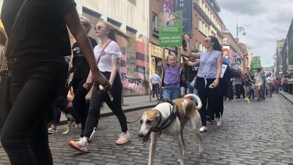 Hundreds of protesters, many of whom came with their four-legged friends rescued from the racing sector, gathered at the Spire on O’Connell Street with placards and banners calling for an end to State and corporate sponsorship of greyhound racing in Ireland.