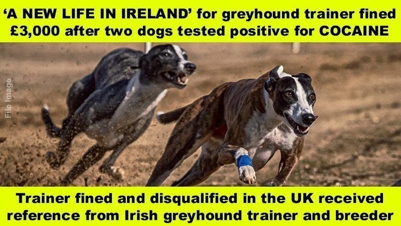 A greyhound trainer fined £3,000 after two of his dogs tested positive for COCAINE, received a reference from an Irish greyhound trainer and breeder who is helping him "start a new life in Ireland".