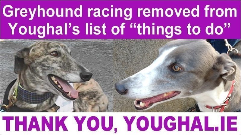 Youghal.ie is the latest to reject greyhound racing. This follows similar moves by Pure Cork, Galway Tourism, Tramore.ie, In Your Pocket City Guides, Air France (which removed Irish greyhound racing from 44 of its international websites), Thomas Cook, Toyota Ireland, Opel Ireland, Heineken Ireland/Murphy’s, Dublin Bus, Eir Sport, Tesco Ireland, Electric Ireland, Applegreen, Barry’s Tea, Hyde Irish Whiskey, Expedia, Galway Crystal, FBD Insurance, Botanica International, Voucher Cloud, Permanent TSB, Maldron Hotels, Clayton Hotels, North Star Hotel Dublin, Metropole Hotel Cork, Treacy’s Hotel Waterford, The Mayson Hotel, Trip Indicator, Food For Thought (the official publication of the Restaurants Association of Ireland), DishCult, Hertz, MummyPages.ie, Ireland Before You Die, Dublin Convention Bureau, etc. Among the charities that have said NO to greyhound racing are Pieta House, Society of St Vincent de Paul, Our Lady’s Hospice, Parkinson’s Ireland, The Hope Foundation, Cara Projects, Movember, Family Carers Ireland and Irish Guide Dogs for the Blind. As have sports groups such as Arklow Rugby Club and Verona FC.