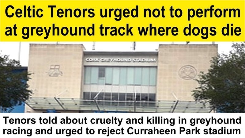 The Celtic Tenors are being urged not to perform at Curraheen Park greyhound track - a venue where dogs suffer and die.