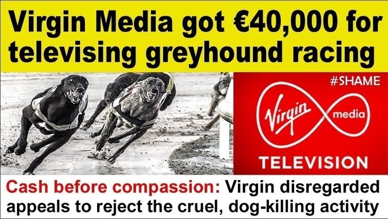 In an appeal to Virgin last year to reject greyhound racing, the Irish Council Against Blood Sport stated: “Virgin Media should NOT be promoting this cruel, dog-killing activity - the public wants to see greyhound racing ended and not given a platform on national television.”