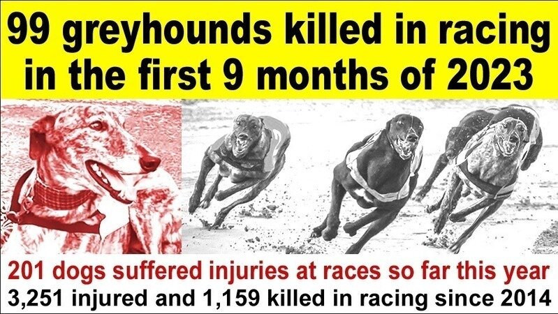 The January to September 2023 figures bring to 3,251 the number of greyhounds known to have been injured and 1,159 the number killed in racing at Irish tracks since 2014.