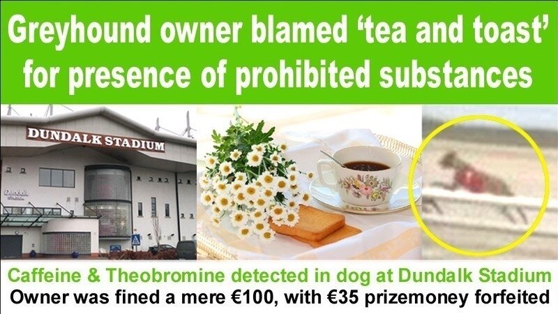 In a greyhound racing control committee report, published on the website of Greyhound Racing Ireland, the committee noted that "the evidence given by Colm Farrelly of Slieve Road, Knockagh, Hackballcross, Dundalk, Co. Louth that the only explanation he could offer for the adverse analytical finding was that members of the household gave the greyhound tea and toast prior to the race".