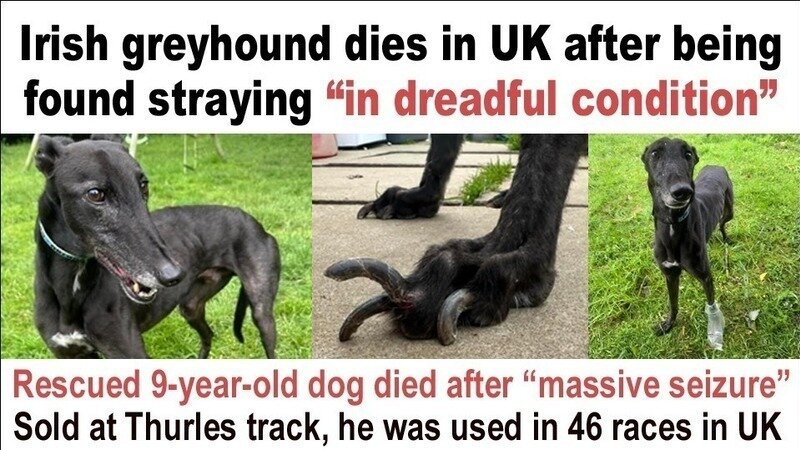 Greyhound Protection UK reported that 9-year-old Sweep “had a massive seizure and didn’t come out of it”.