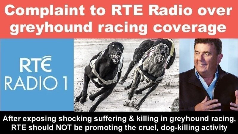 The Irish Council Against Blood Sports has lodged a complaint with RTE Radio 1 over coverage shamefully given to greyhound racing on the Sunday Sport show last month.