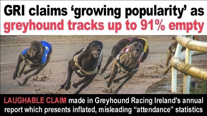 Despite its stadiums being up to 91% empty at races last year, Greyhound Racing Ireland has laughably claimed there is a “growing popularity of greyhound racing amongst the public”.