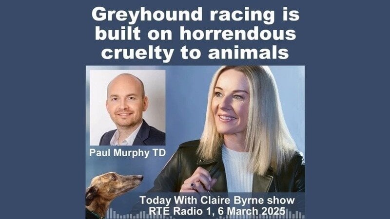 Paul Murphy TD has condemned greyhound racing as an industry "built on horrendous cruelty to animals". Speaking on the Today Show on RTE Radio 1 (6 March 2025), the People Before Profit politician renewed his calls for a ban on greyhound racing.