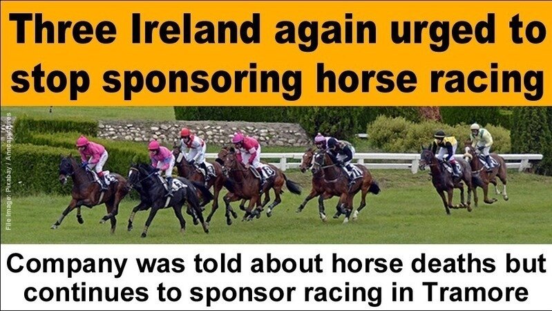 Three Ireland is again being urged to stop sponsoring horse racing. Despite being told about all the suffering and death in racing, the mobile network company is sponsoring the €11,500 “Three Ireland Rated Novice Steeplechase” at Tramore Racecourse on 17th August 2023.