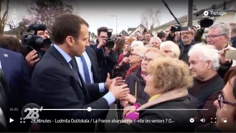 La photo ci-dessus provient d’une rencontre entre Macron et des retraités, la veille ou juste avant (je crois !) de la manif du 15 mars. La séquence a été publiée en particulier sur le 28’ de ARTE, précisément au soir du 15 mars, dans un film qui donne de courts extraits de la manif à Marseille (merci à Pascaline Berg de me l’avoir signalée). Si je vous propose de revenir sur ce qui est un évènement déjà passé, c’est parce qu’il démontre parfaitement ce dont la Politprop est capable, et surtout la dialectique du « président » Macron. Il est intéressant de retranscrire exactement le dialogue, qui reste un modèle de la technique de bluffe du dit Macron :