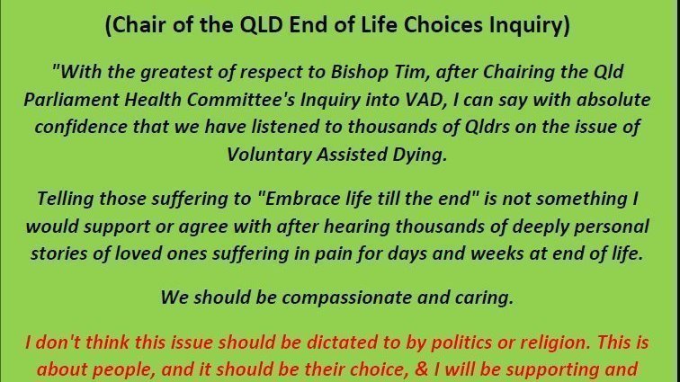 We should remember that these are organisations that are funded by the government! It really isn't fair for those who live with the traumatic experience of nursing a loved one through cruel end of life suffering, or those for whom this legislation would bring much peace of mind (the terminally ill) should have that right taken away from them because of religion or, as the Chair of the Qld End of Life Choices Inquiry stated last week, by politics.