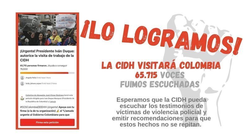 ¡Lo logramos! Con un trabajo sostenido y 65.715 firmas alrededor del mundo, logramos que el Gobierno Nacional aceptara la visita de trabajo de la Comisión Interamericana de Derechos Humanos -CIDH- en el contexto del Paro Nacional.