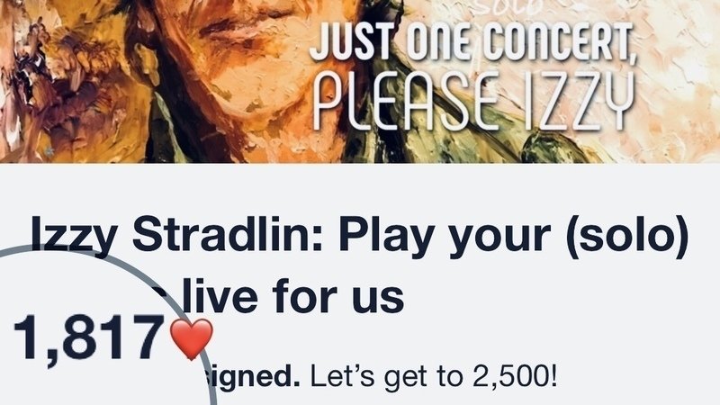 Petition updateIzzy Stradlin: Play your (solo) music live for us1817 - rhymes with 117 (degrees) doesn’t it??