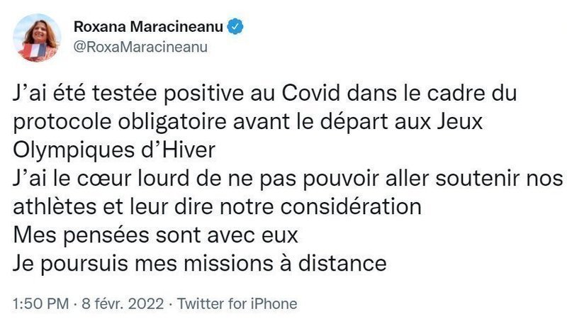 Roxana Maracineanu ne représentera pas la France à Pékin, puisqu'elle a contracté le virus du Covid-19 et qu'elle ne peut donc plus franchir la bulle sanitaire chinoise autour des installations olympiques.