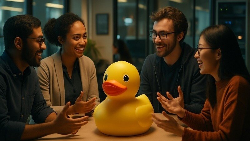 Rubber duck debugging is a well-known practice in the technology and software development fields, where explaining a problem out loud to an inanimate object, often a rubber duck, helps tech professionals to uncover solutions. In our tech lab in Kingston, Ontario, the rubber duck ceremony symbolizes a unifying moment of teamwork, creativity, and problem-solving, tailored to encourage open dialogue and collaborative innovation.