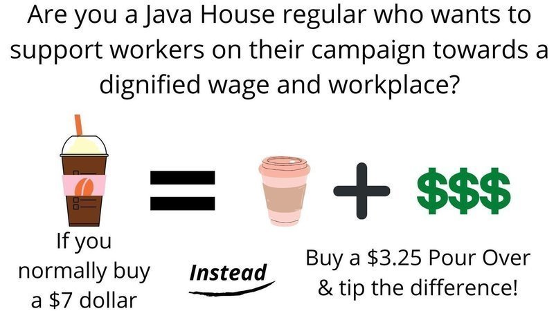 We understand that tips are an important source of income for the workers at Java House, so rather than declare a boycott we are doing something a little different. Our new "Pour Over Campaign" is a way that members of the community who frequent Java House can support the workers. The idea is very simple, instead of whatever specialty drink you normally get, please instead purchase their cheaper pour over coffee and tip the difference between that and what you would normally spend. This way, Java House workers are getting extra tips to help make up for their terrible wages, and their boss is making less money off of your patronage.