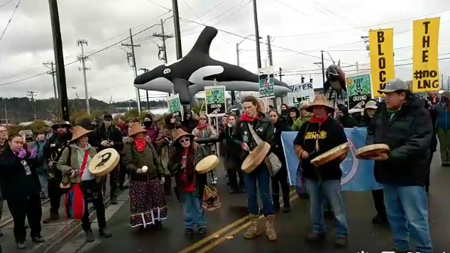 At 5:30 am this morning, several hundred people gathered outside all three entrances to the construction site for Puget Sound Energy's fracked gas LNG facility. Several water protectors chained themselves together at the gates and supporting water protectors stood in solidarity and song. When news of the devastating train wreck 20 miles to the south broke, leaders immediately led everyone in prayer for the victims and their families. The day continued peacefully in prayer and solidarity. One activist and one elder were arrested – we will keep you updated on their situation.