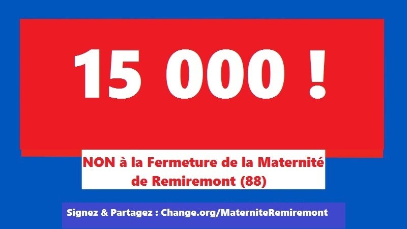 Vous êtes près de 15 000 a avoir contribué à mon action sur la sauvegarde de la maternité de Remiremont menacée de fermeture pour causes financières. Mais ce n'est pas fini ... ! Vous pouvez de nouveau laisser un commentaire, une expérience vécue à la maternité de Remiremont afin de montrée et de laisser votre soutien qui rejoins notre causes. N'hésitez pas également à partager ou à repartager cette pétition au plus grand nombre ( Amis - Familles - Collègues... plusieurs types de partage sont mis en place par Change.org tel quel : Facebook - Tweeter - Mail - SMS où encore un script pour inclure cette pétition à une page web. N'hésitez pas à me contacter pour toutes questions !