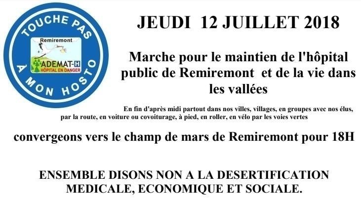 L’ADEMAT-H l’association majeur pour la sauvegarde de l’hôpital de Remiremont sous leurs nouveau slogan « touche pas à mon hosto » organise une marche le 12 juillet prochain.