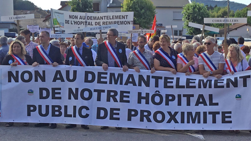 ** Article : RemiremontInfo **Ils étaient un millier au départ du Champ-de-Mars et les rangs se sont élargis au fur et à mesure du cortège. La marche pour le maintien de l’hôpital romarimontain et de ses services a connu un large succès ce jeudi en fin d’après-midi. En tête du défilé, de nombreux élus venus non seulement de toutes les communes environnantes et des vallées, mais encore du nord de la Haute-Sâone. Une forte mobilisation pour dire « Non au démantèlement de notre hôpital public de proximité » ainsi que l’indiquait une large banderole signée par l’ADEMAT (Association pour la Défense, le Maintien et l’Amélioration de la Maternité), association qui a donc désormais ajouté un « H » à son logo. Un « H » traduisant hôpital.Une forte mobilisation puisque les derniers chiffres traduisaient une participation d’environ 1.300 personnes (le nombre de 1.500 était même évoqué). Le mot d’ordre a bien été entendu et dans le cortège, de nombreux écriteaux demeuraient tenus à bonne hauteur afin d’annoncer la couleur. Parmi-ceux, l’on pouvait lire : « Notre hôpital, il est vital », « Non à l’agence de la ruine de la santé », « Le service public est le patrimoine de ceux qui n’en ont pas ! », « La santé, ça ne s’achète pas, ça ne se vend pas »ou encore « Oh, Béatrix, si tu savais… et de l’ARS te méfierais… et Sanzalone tu renverrais ! ». (NDLR : Eric Sanzalone est l’actuel directeur du centre hospitalier).Sur le parcours, des slogans ont été scandés : « Sauvons l’hôpital », « Maternité en danger », « Gardons l’hôpital ». Le cortège a entièrement descendu la rue Charles de Gaulle et a marqué un court arrêt devant « l’Accueil », place Jules Méline, où le prénom de Christian a résonné comme un appel, un SOS, face à une fenêtre ouverte. On l’aura compris, prénom lancé à l’adresse de Christian Poncelet, résident des lieux, lui qui avait en son temps inauguré le nouvel hôpital après sa construction.La vigilance reste de miseArrivé un peu plus haut, face à l’entrée du centre hospitalier, le cortège retrouvait sur place Jean Hingray, le maire de Remiremont et son conseil municipal. L’on sait que la municipalité romarimontaine avait retenu ce même soir afin de dévoiler une plaque redonnant le nom de « Béatrix de Lorraine » au centre hospitalier. Une femme qui avait voulu un premier hôpital (1724) pour y accueillir les vieillards et les pauvres. Puis l’ensemble des participants à la marche rejoignaient le parvis de l’Hôtel de Ville. Jean Hingray demanda alors à toute l’assemblée d’applaudir généreusement les gens de l’ADEMAT pour leur combat et les actions entreprises.Il appartenait ensuite au président Jean Pierrel de rappeler qu’en mars 2016, sur ce même parvis de l’Hôtel de Ville, 2.000 personnes étaient déjà réunies pour une cause juste : défendre la maternité. Aujourd’hui, à son logo, l’ADEMAT a donc dû ajouter un « H » pour défendre l’hôpital. Dans un discours offensif, le président Pierrel a fait valoir plus d’un argument, traduisant notamment un « non » catégorique au transfert sur Epinal de certaines activités chirurgicales, de même concernant les urgences lourdes de nuit… Autant de points évoqués et largement applaudis par l’assemblée présente.Prenant à son tour la parole, Christophe Naegelen, député de la circonscription, a tenu à préciser que tous les parlementaires vosgiens ont voté contre le Budget Santé proposé par le Ministère, déclarant : « il n’est pas normal que nos petites villes soient désavantagées ».A noter que pour l’hôpital, le comité de pilotage (Copil) doit se réunir la semaine prochaine. « Nous restons à l’affût de ce qui va en ressortir » a traduit Jean Pierrel. Autant écrire que le président de l’ADEMAT et ses équipes entendent rester plus que vigilants en cette période de vacances. Quitte à mobiliser encore davantage et réunir si nécessaire 3 à 4.000 personnes sur la place en septembre. Le combat continue et c’est une Marseillaise entonnée unanimement qui a résonné ce jeudi soir place de l’Abbaye.D.P.Photographies : Jean-Claude Olczyk.Retrouvez l’article complet & photos ici : http://remiremontinfo.fr/2018/07/remiremont-1-300-personnes-rues-de-cite-defendre-lhopital/