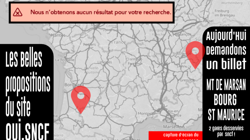 Atualização do abaixo-assinadoPour des billets SNCF non limités à 2 changements pour des trajets + directs et - chersBillet de train Mont de Marsan - Bourg St Maurice : Oui.SNCF ne sait pas faire