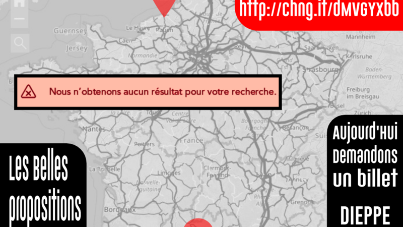 Petition updatePour des billets SNCF non limités à 2 changements pour des trajets + directs et - chersDieppe - Mazamet : impossible d’obtenir un billet de train sur Oui.SNCF