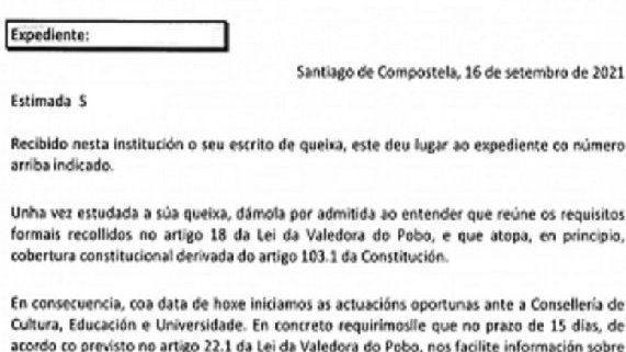 Nuestras quejas han sido admitidas y ha iniciado las actuaciones oportunas ante la Consellería de Cultura, Educación e Universidade requiriéndole que en el plazo de 15 días facilite información sobre los motivos de nuestras quejas.