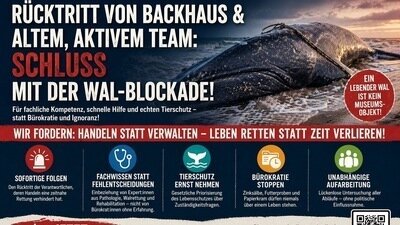 We demand the removal of Dr. Stephanie Groß from operational whale rescue. Her expertise lies in studying dead animals (pathology). An animal in distress requires specialized clinical veterinarians, not researchers. It is a farce that a scientist without experience in large whale rehabilitation decides on palliative measures.
