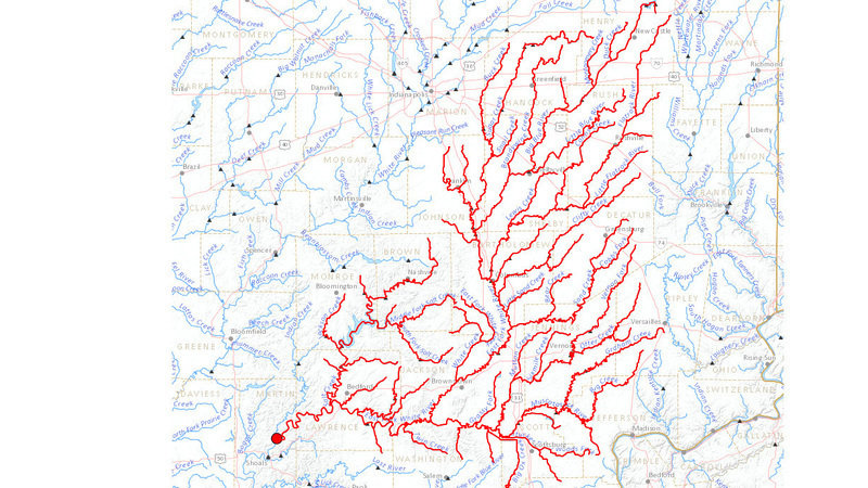 (The image shows the watershed above Williams Dam. Approximate area affected: 4889 square miles; 5 HUC 8 watersheds; 1530 miles of 65 named streams; 5 Congressional districts [not just Todd Young's!];