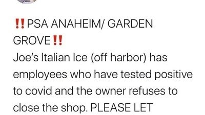 while I do love joe’s Italian ice the lack of safety and the popularity of the location is put local Anahiem residents at risk! And should be shut down immediately if not at least social distancing should be put in place! But due to the number of cases and amount of people visiting it should be closed overall!