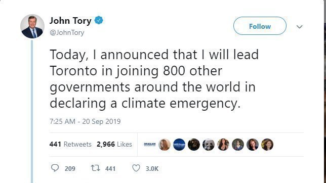 Although we did not get nearly as many signatures as we had hoped, we did get noticed, and this initiative, along with a few others that were set in motion simultaneously, has resulted in Mayor Tory stating that he will declare a climate emergency: