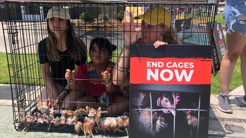 Jollibee’s leadership is ignoring the public outcry urging them to go cage-free globally. We amped up the pressure last week by attempting to speak to Jollibee leadership at their US headquarters! Unfortunately, security turned us away so we made sure to get their attention by chanting on the sidewalk in front of their building. Protestors have also been disrupting the workday at dozens of Jollibee, Smashburger, and Coffee Bean and Tea Leaf locations around the US. Let’s continue to call out Jollibee for its failure to address animal welfare.