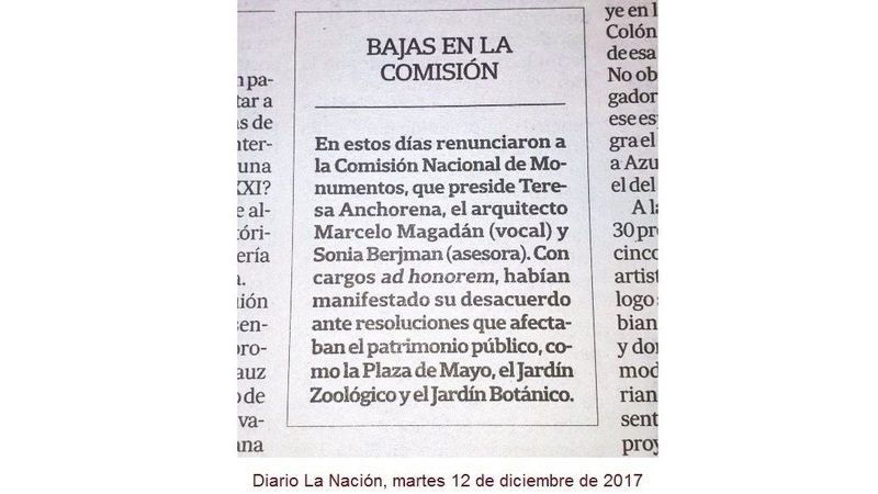 Sonia continúa defendiendo el legado cultural de Buenos Aires. Ella ha renunciado a su cargo de asesora ad-honorem de la Comisión Nacional de Monumentos. Adjunto el texto de su renuncia, presentada el 3 de diciembre pasado: