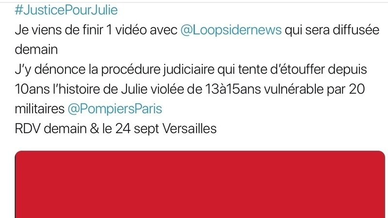 Petition updateJulie violée à 13 ans par des Pompiers : justice pour obtenir la requalification en violMon témoignage vidéo demain sur Loopside pour dénoncer la procédure judiciaire de Julie