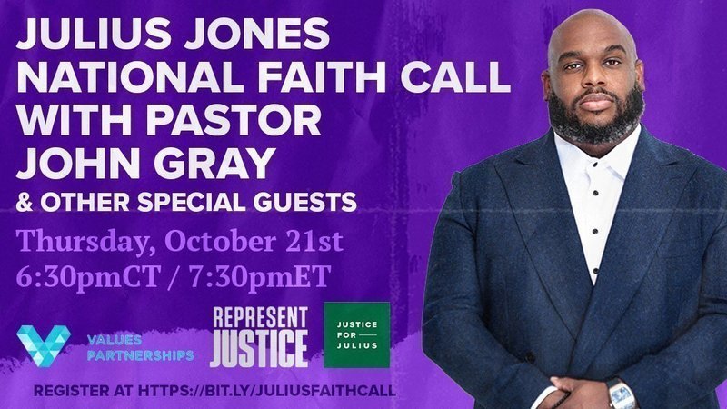 Please join Pastor John Gray, Values Partnerships, and the Justice for Julius Campaign this Thursday, October 21st at 6:30pmCT/7:30pmET for a critical update on Julius Jones and what you can do. We also need you to share this invitation with your networks as soon as possible! All are welcome and can register here to receive the event link: https://bit.ly/Juliusfaithcall