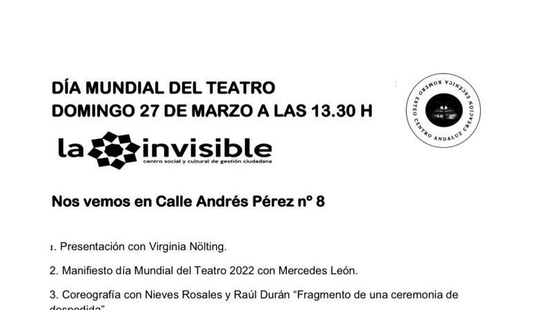 Petition updateJUNTA DE ANDALUCÍA: EL CENTRO ANDALUZ DE CREACIÓN ESCÉNICA EN EL CONVENTO DE LA TRINIDADDOMINGO 27 DÍA MUNDIAL DEL TEATRO A LAS 13.3O H EN LA INVISIBLE