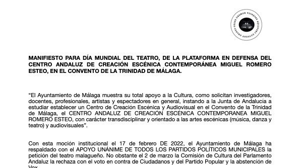 Mise à jour sur la pétitionJUNTA DE ANDALUCÍA: EL CENTRO ANDALUZ DE CREACIÓN ESCÉNICA EN EL CONVENTO DE LA TRINIDADModificación en el programa y manifiesto de la plataforma.