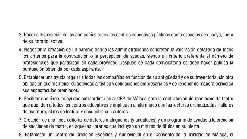 En las páginas 30 y 31 de las conclusiones del TERCER CONGRESO PROVINCIAL DE ARTES ESCÉNICAS DE MÁLAGA se recogen nuestras propuestas pero, teniendo en cuenta el apoyo, tanto del Ayuntamiento de Málaga como de la profesión, nos sorprende que la petición de un Centro Andaluz de Creación Escénica Contemporánea en el Convento de la Trinidad, no forme parte de las conclusiones finales. En cualquier caso agradecemos la referencia a nuestra petición