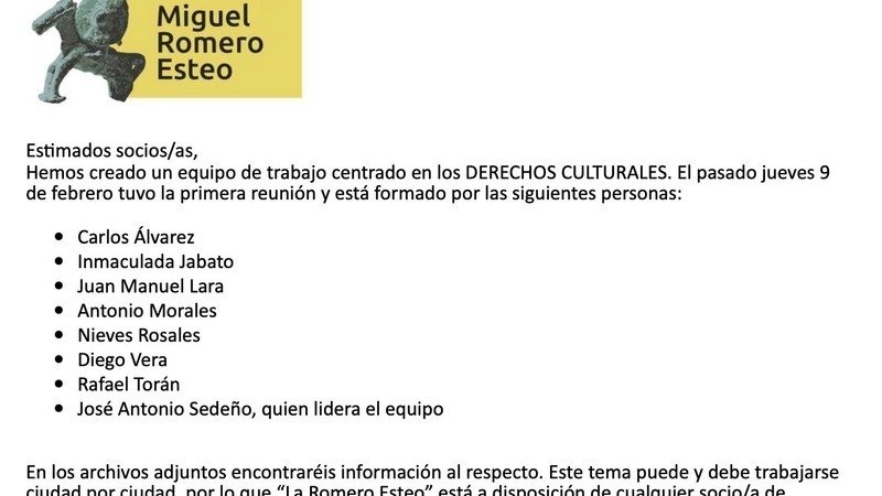 La asociación cultural MIGUEL ROMERO ESTEO, ha creado el grupo de trabajo por los DERECHOS CULTURALES. Este grupo de trabajo está constituido por personalidades de diferentes ámbitos de la Cultura y del Derecho y me han invitado a coordinarlo como portavoz de la plataforma en defensa del Centro Andaluz de Creación Escénica Contemporánea Miguel Romero Esteo en el Convento de la Trinidad.