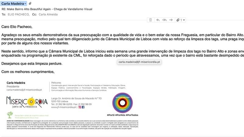 Graças ao seu apoio, estamos recebendo cada vez mais apoio. A seguir, teremos uma história sobre nossa petição na mídia na próxima semana. Também começaremos a distribuir panfletos aos moradores, empresários e trabalhadores do Bairro Alto. Recebemos um email de Carla Madeira (Presidente da Freguesia) ... Em anexo, você encontrará a comunicação. Parece que ela não entende o que estamos pedindo, que é uma Força-Tarefa para combater o vandalismo. Ela afirma que eles limparão o bairro ... no entanto, isso não vai resolver a situação, pois será apenas temporária. O vandalismo reaparecerá tão rápido quanto o limparmos. Precisamos de uma estratégia de longo prazo de múltiplas frentes.