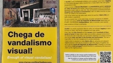 Graças ao seu apoio, alcançamos 425 assinaturas. Devido ao Coronavírus, teremos que esperar até 1º de junho para distribuir nossa brochura na comunidade do Bairro Alto. Enquanto isso, continue compartilhando esta petição o maior número possível de pessoas. Obrigado por ajudar a tornar o Bairro Alto Bonito de Novo!