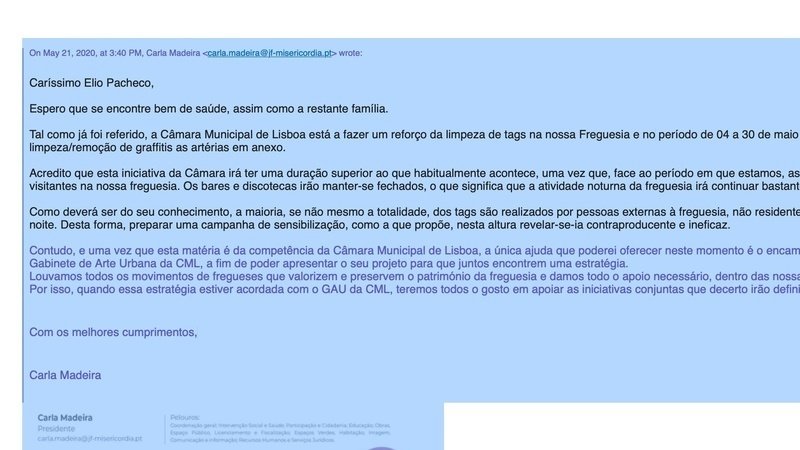Hello, our supporters... below is the response so far from Ms. Carla Madeira (President of the Freguesia). So far, her response is quite frustrating. It appears that she does not consider the vandalism in our neighbourhood to be a serious concern. Clearly, she does not live in Bairro Alto and prefers to let things be as they are. As taxpayers, residents and citizens, we need to pressure her and her administration to take action! We need a comprehensive long-term strategy to combat this plague. Please support us by sharing our petition with as many people as possible. Together, we can make a difference! Strangely enough, she suggests that we speak to a department of the CML that deals with "official Graffiti" when we are discussing vandalism. Simply a way to deflect responsibility and complicate matters.
