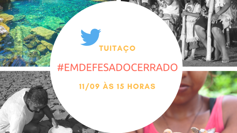 Olá! Mais uma vez te escrevo para pedir sua ajuda, que é fundamental para fazer ecoar as vozes dos Povos do Cerrado! Amanhã, dia 11 de setembro, é o Dia Nacional do Cerrado e vamos fazer um tuitaço, às 15h, com a tag #EmDefesadoCerrado. Contamos com seu apoio, compartilhe essa mensagem nas mídias sociais, toda ajuda é bem-vinda! A nossa força está em poder contar com você. Juntos vamos barrar a destruição do Cerrado!