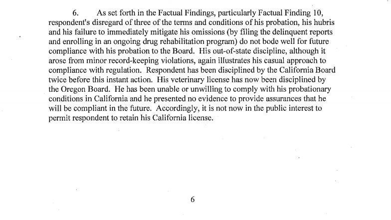 Pictured here is a screen capture of the 2008 court document where California had enough. Koller graduated UC Davis in 1974. In 1975-1976 he worked at an animal clinic in Monterery, CA, where he was accused of beating a German Shepherd and allowing a student to operate on an animal. That led to 100 days in jail in 1977. In 1979 his license was suspended in CA for 5 years. In 1984 his CA license was reinstated for another 5 year probation. While that would likely mean it was fully reinstated in 1989, the court doc says 1999 (may be a typo). In 2001, after finding Dr. Koller and his wife almost overdosed on veterinary controlled substances in front of their teenage daughter, his license was suspended in CA. In 2004, his CA license was revoked, stayed, suspension and probation. In 2008, since Dr. Koller did not pass probation was disciplined in the state of Oregon, CA permanently revoked Dr. Koller's license. During the years in OR, civil suits were filed with complaints of animal abuse. In OR, his license was revoked in 2010, but reinstated in 2015. Since 2015, many complaints were filed. In 2019, Koller was charged with aggravated animal abuse for directly causing the death of Bleu, a 7 month old dachshund.