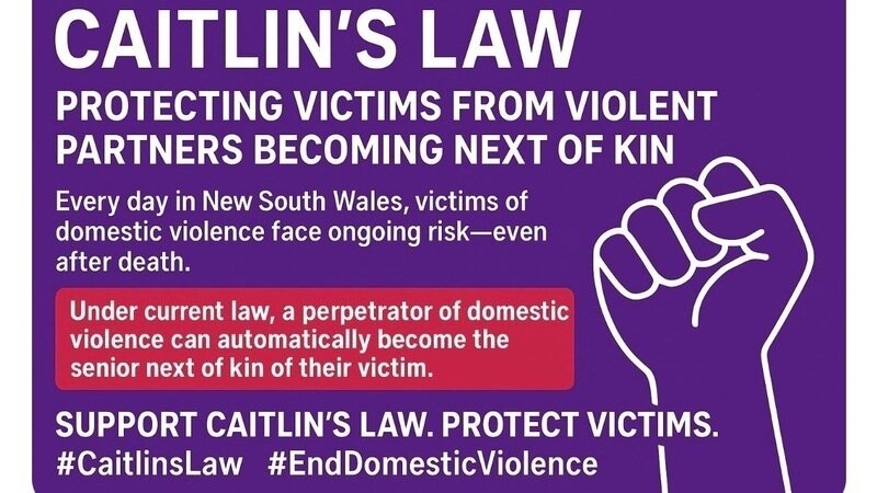 we are calling on parliament of NSW to introduce Caitlin’s Law, a law reform that will see abusers of domestic violence disqualified from becoming their victims next of kin.