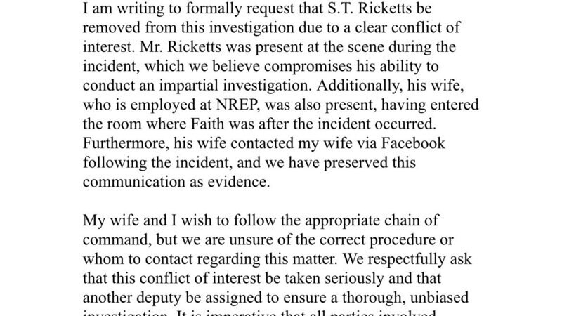 I am writing to formally request that S.T. Ricketts be removed from this investigation due to a clear conflict of interest. Mr. Ricketts was present at the scene during the incident, which we believe compromises his ability to conduct an impartial investigation. Additionally, his wife, who is employed at NREP, was also present, having entered the room where Faith was after the incident occurred. Furthermore, his wife contacted my wife via Facebook following the incident, and we have preserved this communication as evidence.