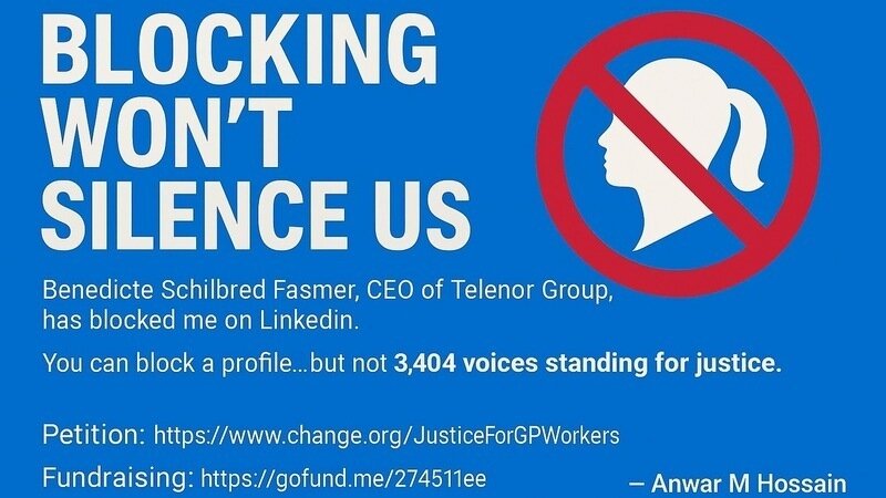 আজকে একটা অদ্ভুত জিনিস হলো—Telenor Group-এর CEO Benedicte Schilbred Fasmer আমাকে LinkedIn-এ ব্লক করে দিলেন।