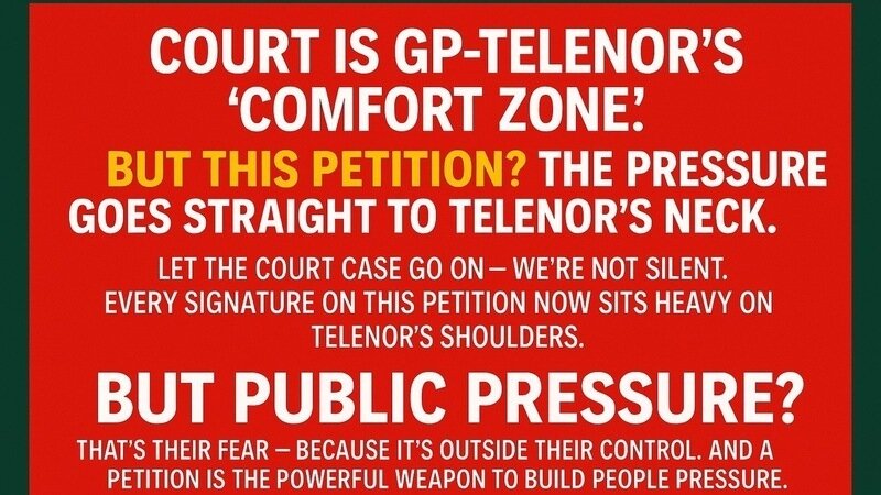“কোর্ট কেস চলুক তার গতিতে — আমরাও চুপ নেই। এই পিটিশনের প্রতিটা সই এখন টেলিনরের ঘাড়ের ওপর বোঝার মতো চেপে বসেছে।”