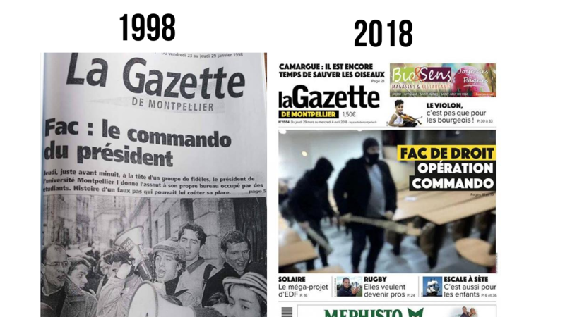 Le jeudi 15 janvier 1998, un commando armé de « barres de fer » expulsait violemment une quarantaine d’étudiants de l’université Montpellier 1 (UM1) occupant les bureaux de la présidence. Les étudiants manifestaient leur opposition à la décision du président de l’université, Yves Loubatières, d’attribuer la gestion des cafétérias des facultés de droit et de Richter, jusqu’alors cogérées par des associations étudiantes, à des entreprises privées. Vingt ans plus tard, le jeudi 22 mars 2018, un commando cagoulé, armé « de planches de palettes avec des clous […] et d’un taser » expulse violemment une soixantaine d’étudiants occupant pour la nuit l’amphithéâtre A de la faculté de droit et de science politique de l’université de Montpellier (fusion de l’UM1 et de l’UM2). Ils protestent contre la loi ORE, qui renforce la sélection à l’entrée des études supérieures. Ces deux opérations commandos impliquent directement des membres de l’institution universitaire. Derrière l’image d’une institution d’excellence, la faculté de droit de Montpellier renferme des vieux relents fascistes.